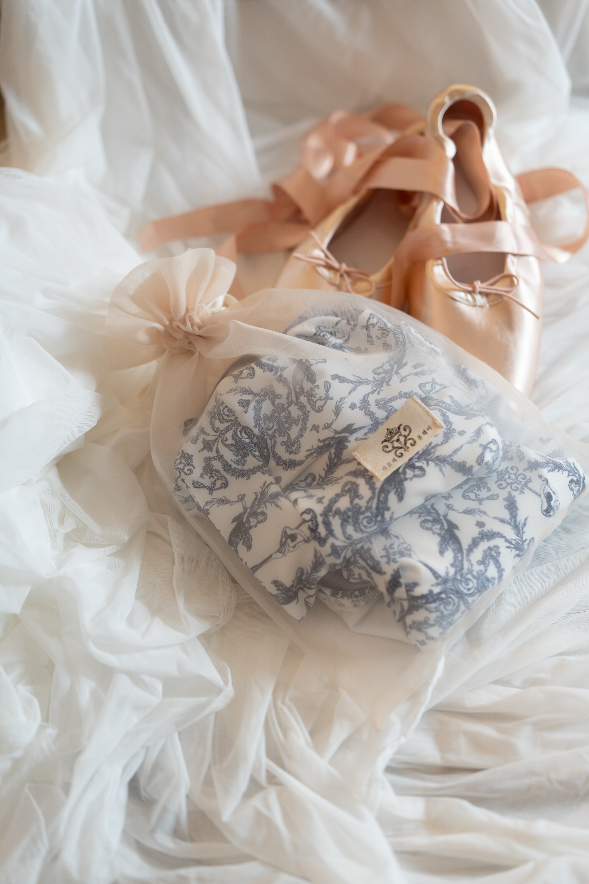 구김이 잘 가지 않고 은은한 광택이 있는 베이지색 오간자 원단으로 프릴이 있는 형태로 제작된 더스트 백입니다.